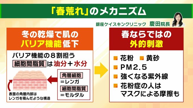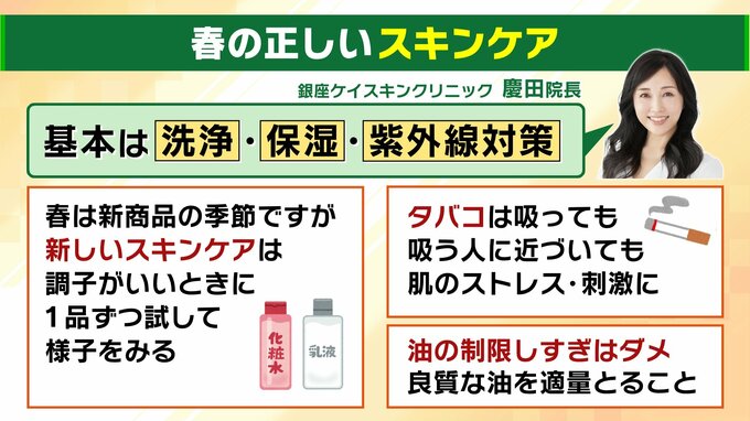 春の正しいスキンケア、基本は「洗浄」「保湿」「紫外線対策」(銀座ケイスキンクリニック・慶田朋子院長)。