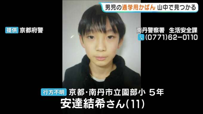 【南丹市小5行方不明】山中で黄色い通学用のかばん「ランリュック」見つかる 警察が40人態勢で捜索 京都・南丹市 2026年3月30日(月) 12:10 国内 京都府南丹市で3月23日から行方不明になっている男子児童の通学用かばんが、山の中で見つかっていたことが分かりました。 警察などによりますと、南丹市立園部小学校5年の安達結希さん(11)は3月23日の午前8時ご…