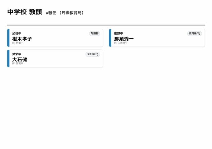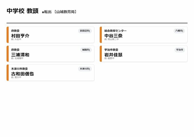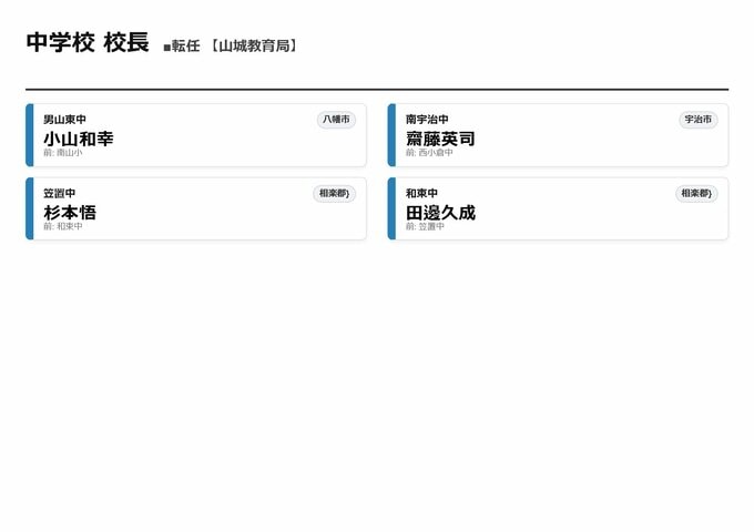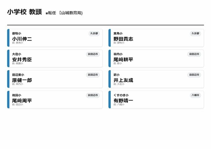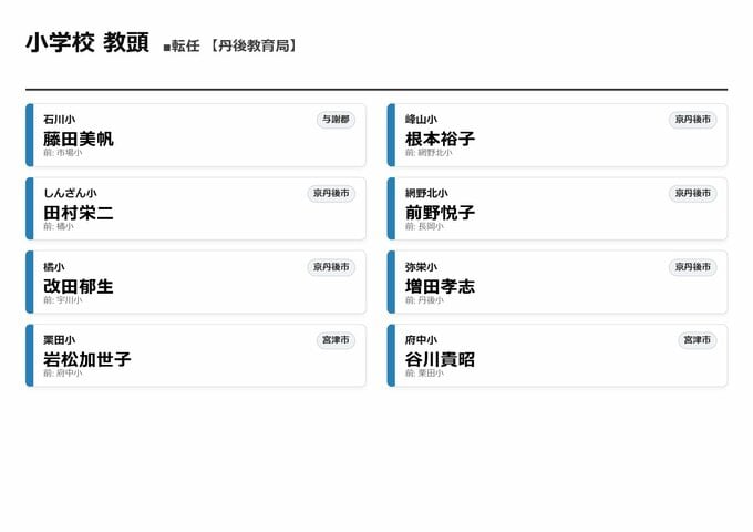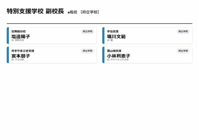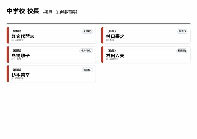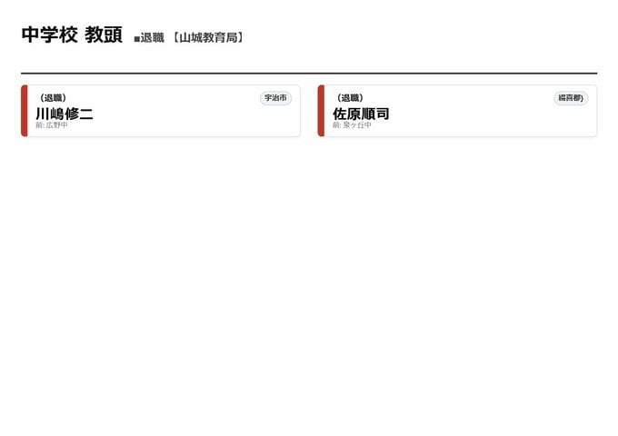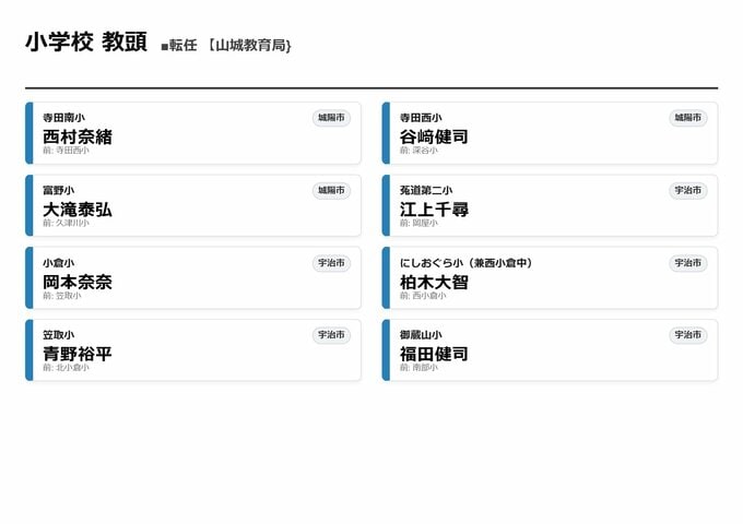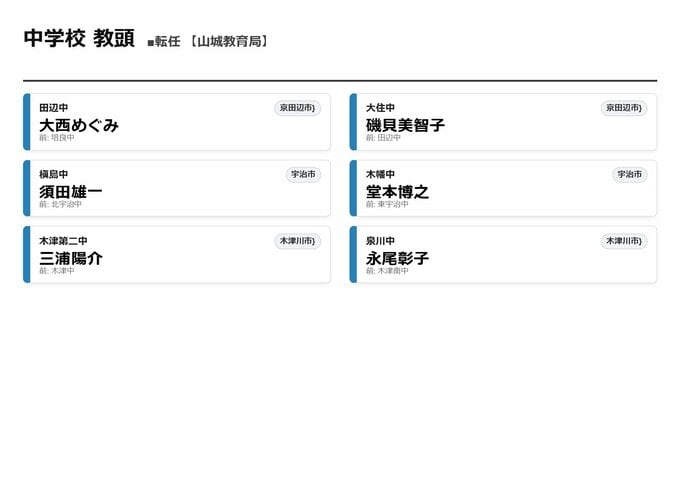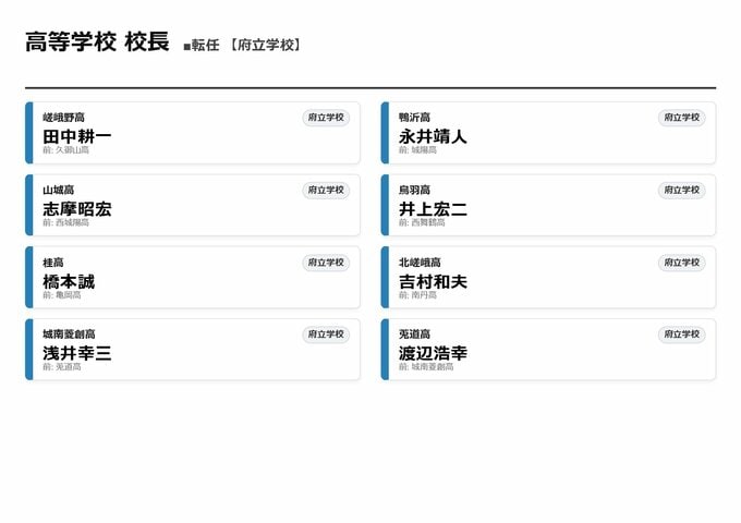 MBS編集部セレクト 【京都府・教職員人事異動2026】校長、教頭先生などの退職転任「あの先生どこ行ったん?」全掲載(小学校、中学校、義務教育学校、教育委員会) 2026年3月31日(火) 18:52 国内 以下、【画像で見る】京都府の小・中・高等学校などの教職員異動情報一覧