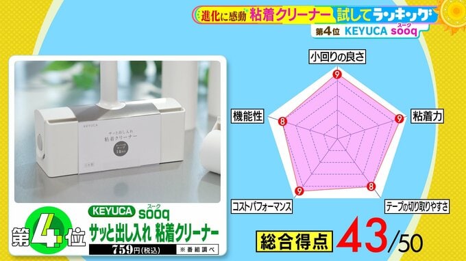 第4位は、KEYUCAの『sooq(スーク) サッと出し入れ 粘着クリーナー』(税込759円 ※番組調べ)。