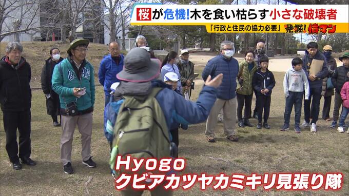 兵庫県では「Hyogoクビアカツヤカミキリ見張り隊」を結成。隊員ら約30人が幼虫の被害を受けた木の見分け方や、成虫を見つけたあとの対処法などを学びます。