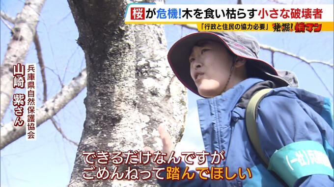 (兵庫県自然保護協会・山崎紫さん)「まず簡単なのは足元ですね。ここに茶色いの(フラス)がドバドバっと。殺虫剤で殺す場合、気絶で終わっている場合がある。動かなくなったと思っていたら、時間がたつと動き出したりする。できるだけなんですが、ごめんねって踏んでほしい」