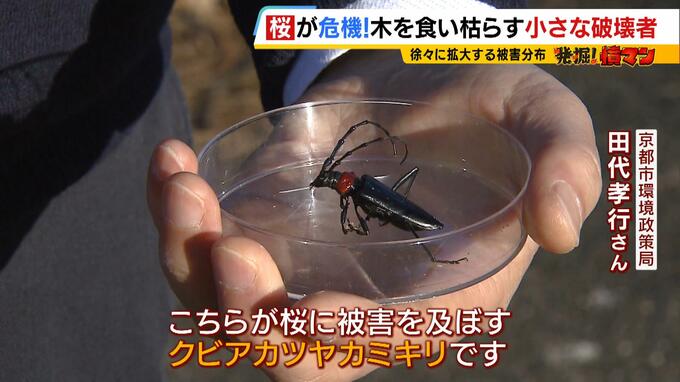 (京都市環環境政策局・田代孝行さん)「こちらが桜に被害を及ぼすクビアカツヤカミキリです」