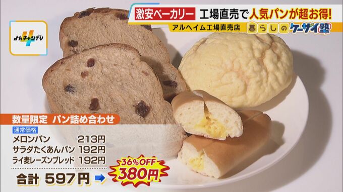 (中野アナ)「食パンは1つ(4枚入り)で税込み150円。こちら数量限定パンの詰め合わせ。食パンとかメロンパンとか、かなりずっしり入って380円」