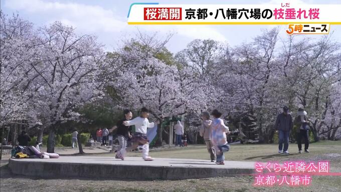 今週満開を迎えた京都の桜。京都府八幡市にあるさくら近隣公園でも約250本の桜が見ごろを迎えています。目玉の枝垂れ桜は、親子連れでにぎわう公園を抜け、奥に進んだ先のひっそりとした場所にあります。