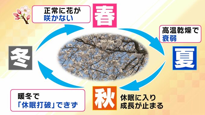 また、桜が咲くメカニズムにも悪影響を及ぼしています 。通常、冬に厳しい寒さを経験することで花の芽が目を覚ます「休眠打破」が起こり、春に向けて開花していきます 。