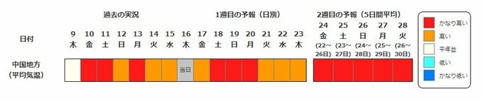 中国地方の向こう2週間の気温は、暖かい空気に覆われやすいためかなり高い日が多い見込みだということです。