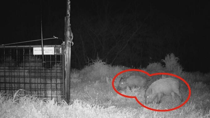 そして、勢いよく扉が下りると、びっくりしたのかイノシシが一目散に逃げていきました。しかし、よく見てみると、檻の中に1頭、イノシシが入っています。