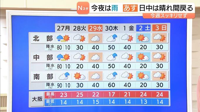 【近畿の天気】27日(月)は晴れ間戻り昼間は過ごしやすい 今週は曇りや雨が多くなりそう 2026年4月26日(日) 18:02 国内 4月27日(月)の近畿地方は、晴れ間が戻るでしょう。昼間は過ごしやすくなりそうです。 低気圧が南岸を進む影響で、明け方までは広い範囲で雨が降り、南部では激しく降る所もあるでしょう。朝まで雨の残る所が…