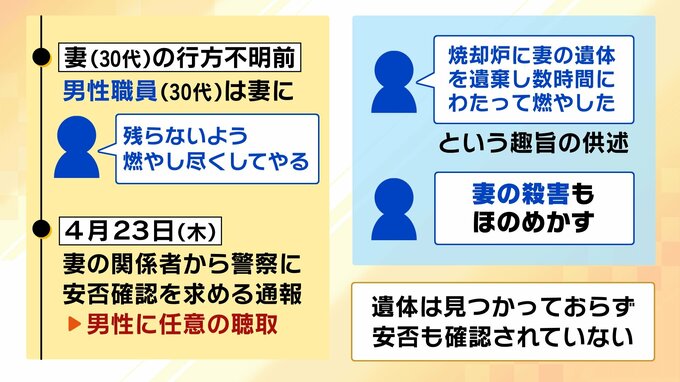 行方不明になる前に妻は、「夫から脅迫を受けていて怖い」という趣旨の相談を親族にしていたといいます。また捜査関係者への取材で、男性は妻が行方不明になる前に「残らないよう燃やし尽くしてやる」などと脅していたと見られることが新たにわかりました。