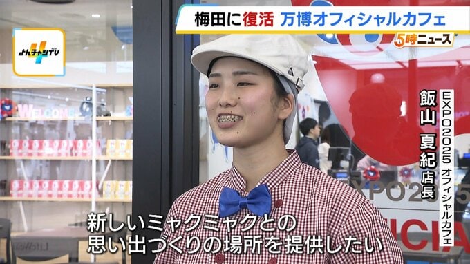 (EXPO2025オフィシャルカフェ 飯山夏紀店長)「半年間という期間限定のカフェにはなりますが、今公開している(イートイン)席は満席となっている。お客様自身のミャクミャクへの愛が冷めておられないんだなと思うので、万博の思い出を大切にしながら新しいミャクミャクとの思い出づくりの場所を提供したい」