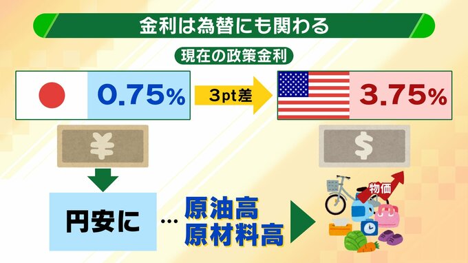 一方で金利が低いと「為替」にも影響があり、円安の懸念が生じます。現在、日本の金利が0.75%であるのに対し、アメリカは3.75%。その差は実に3ポイントもあります。