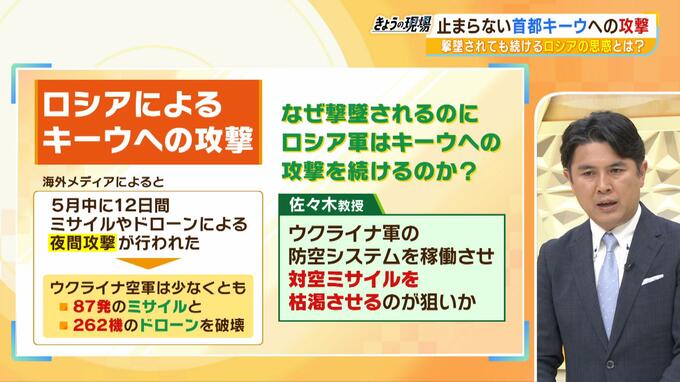 ーーロシアによるキーウへの攻撃ですが、5月の10日間でミサイルやドローンによる夜間攻撃がありました。87発のミサイルと262機のドローンを破壊したとウクライナは話しています。なぜ撃墜されるのに、ロシア軍はキエフへの攻撃を続けるのか?佐々木教授によると、ウクライナ軍の防空システムを稼働させ、対空ミサイルを枯渇させるのが狙いではということですか?
