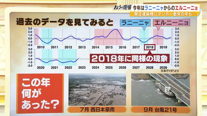 「過去にも2018年にラニーニャがエルニーニョに急に切り替わったっというタイミングがありました。この年は大雨や台風に相次いで見舞われた年だったんですね。7月の西日本豪雨で中国・四国を中心に近畿でも大きな被害が出ました。また関西空港の連絡橋にもぶつかった台風21号が起きたのも2018年でした。同じ状況だからこれと同じような状況が必ずしも起きるというわけではないんですけど、こういう大雨や台風に十分注意が必要な年になるんじゃないかなと思っています」