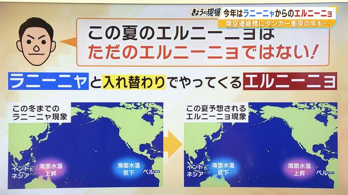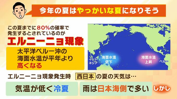 「西側のインドネシア辺りの海面水温はちょっと低くなるのが一般的な状況ですね。このエルニーニョ現象が起きているときは、海の温度が巡り巡って、日本の天気にも影響してくることがあるんですね。このエルニーニョ現象が起きているときは西日本は気温が低く、冷夏になりやすいと言われています。雨が日本海側で多いということがわかっています。ただ、今年の夏のエルニーニョは、単なるエルニーニョではなさそうというのが、今年の冬まではラニーニャというエルニーニョと全く反対の現象が起きていたんですね。ラニーニャから、急に入れ替わりでやってくるエルニーニョ現象というところが大きなポイントです。ラニーニャ現象はエルニーニョと反対でペルー沖の海面水温が低くなる。インドネシアのあたりで水温が高くなるというものなのですが、急激にこのエルニーニョに変わってきているっていうことで、日本の天気にも影響が出てもおかしくないという状況になってるんですね」