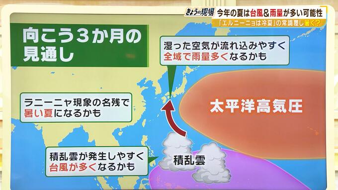「3か月の見通しが気象庁からも出ていまして、どういったことが起こりそうかというのを見ていきますと、ラニーニャの影響がまだ若干残っていて、インドネシアあたりの海水温が高めなんですね。海面水温が高いと台風が起こりやすい積乱雲が発達しやすい特徴があるので、この先もしかしたら台風がちょっといつもより多くなってしまうかもしれないです。あとエルニーニョの影響が出てきますと、太平洋高気圧の張り出しが弱まる傾向があるのですが、今年の夏は日本の南の方で少し張り出しが弱くなりそうな見通しです。どうなるかというと、高気圧は時計回りに風が吹いていますので、縁を回って湿った空気が日本の方にに流れ込みやすくなります。それが梅雨前線を刺激してしまうと、また梅雨時に今回のような大雨に襲われてしまうような恐れがあるということなんですよね」