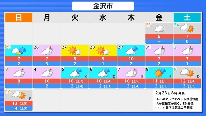 23日(金)の石川県内は、日本の南にある前線の影響ですっきりとしない天気が続き、寒気の影響で日中は震える寒さとなりそうです。