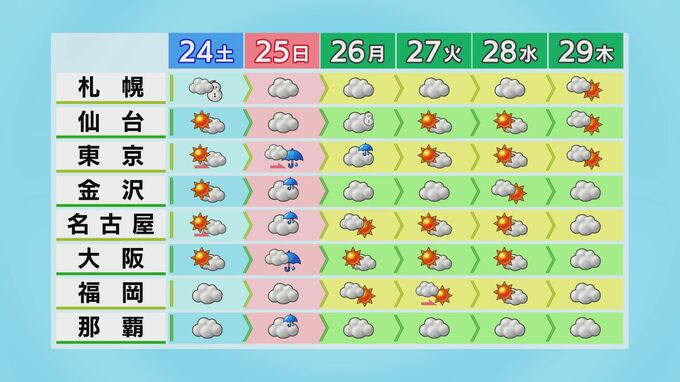 24日(土)は加賀を中心に晴れるでしょう。お出かけや洗濯物を干すなど日差しを有効にお使いください。