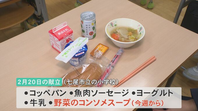 20日の七尾市の小学校の献立は、コッペパンに魚肉ソーセージ、ヨーグルトと牛乳でしたが、これに野菜のコンソメスープが加わりました。