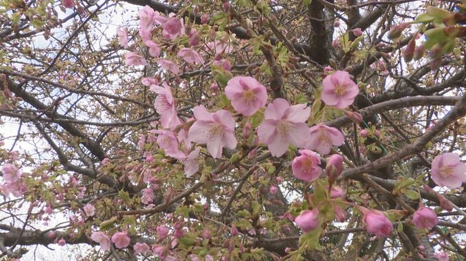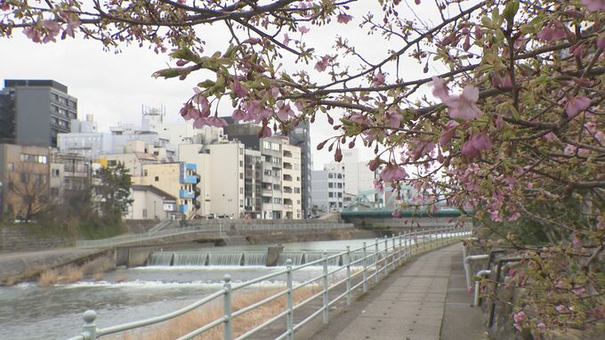 午前中は晴れ、午後からは雲がかかってきた石川県内の空ですが、金沢市千日町の犀川沿いにある1本の河津桜は、早くもピンク色の花が咲き始め小さな春の訪れを告げていました。