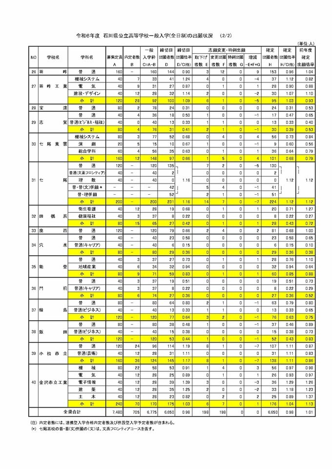【全学校掲載】石川県公立高校一般入試2024(令和6年度)…錦丘1.50倍,桜丘1.43倍,金沢西1.35倍…全日制の出願倍率が確定 2024年2月29日(木) 17:05 石川 確定出願一覧(県教委提供) 確定出願一覧(県教委提供) 入学試験は来月6日と7日に行われ、合格者は来月14日の正午に発表されます。