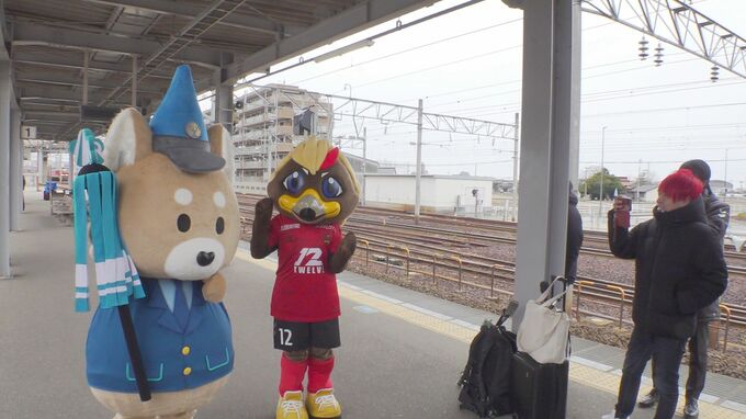 3日、ホーム開幕戦に臨む明治安田J3リーグのツエーゲン金沢。新しいスタジアムの最寄り駅、東金沢駅ではチームにちなんだ列車の入線メロディーに変わりました。