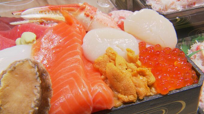 北海道からは、特大ホタテにサーモン、アワビが贅沢にのった豪華海鮮丼。滋賀県からは、寿司にすき焼き、ステーキと近江牛づくしの豪華三種盛弁当。さらに大分県からはクリームたっぷりの生カヌレがそれぞれ初お目見え!