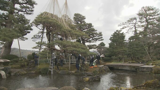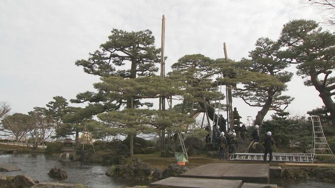 兼六園での雪吊りの取り外し作業は、およそ800か所で今月21日まで行われ、最終日には、園内随一の枝ぶりを誇る唐崎松で雪吊りが取り外される予定です。