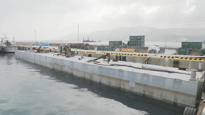 15日には仮桟橋を海底につなぎとめるためのアンカーや部品の設置作業が進められていました。仮桟橋の設置は作業船を使って行うため、天候を見ながら早ければ16日にも行われるという事です。