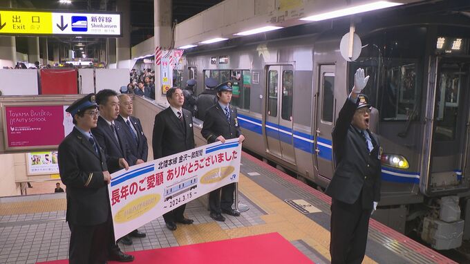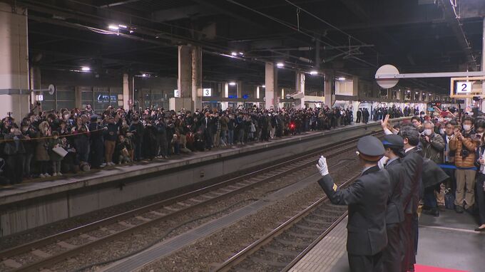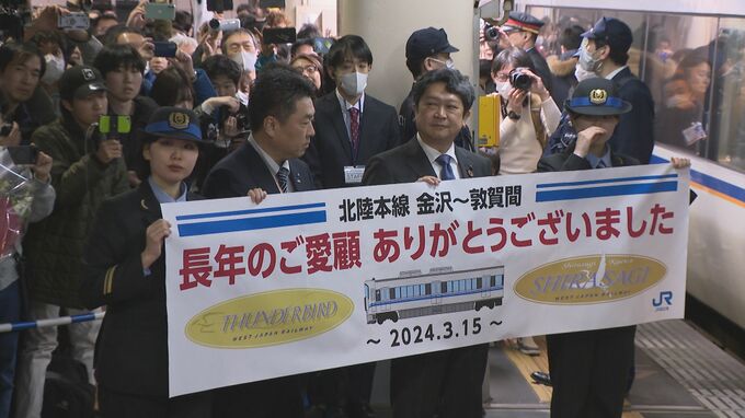 北陸新幹線の延伸開業に伴い、金沢駅と中京・関西方面を結んできた特急列車は16日から敦賀駅発着となります。金沢駅では15日夜、大勢の鉄道ファンが集まり、「ありがとう」のコールが響く中、名古屋方面へ向かう「しらさぎ」と大阪方面への「サンダーバード」を見送りました。サンダーバードの前身「雷鳥」を含め、国鉄時代から半世紀以上にわたって北陸と関西・中京方面を結んできた特急列車が終焉を迎えます。