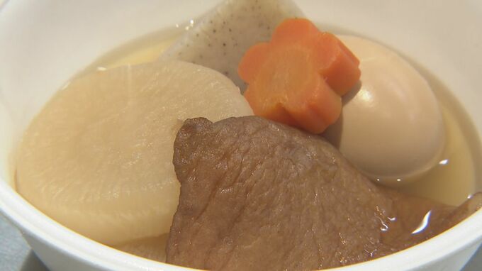 きょうの献立は五目ごはんに小松菜の胡麻和え、ポテトサラダにおでん。使われている野菜やコメは全て有機農業で育てられたものです。