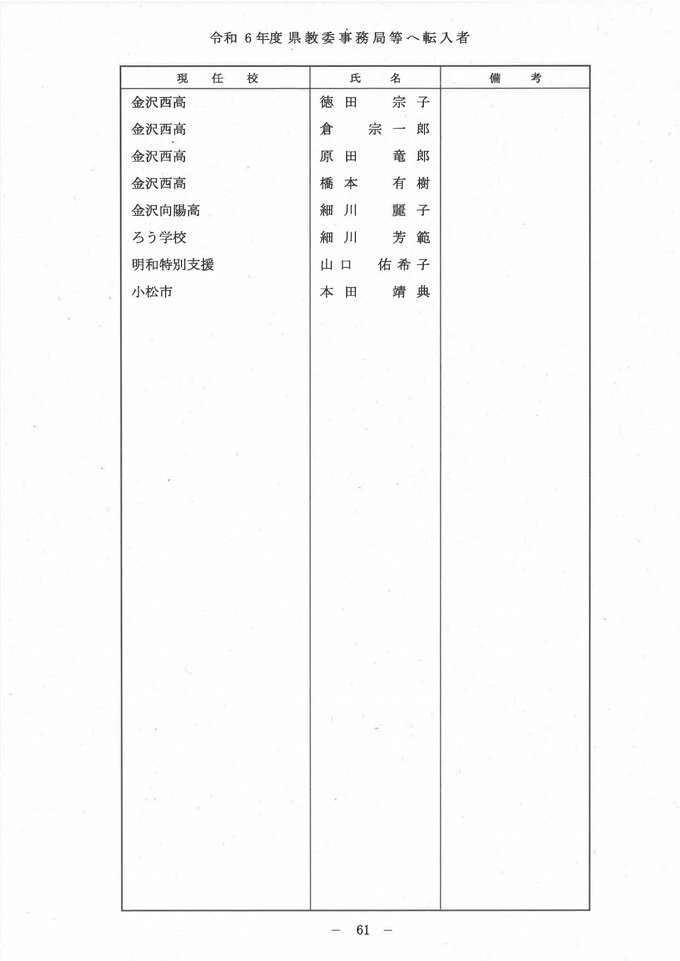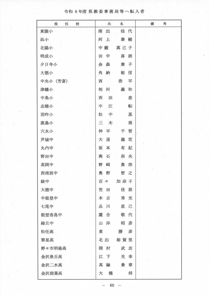石川県 教職員人事異動一覧2024「あの先生はどこへ?」小学校・中学校・高校・特別支援学校 2024年3月22日(金) 11:14 石川 県教育委員会事務局等への転入者 県教育委員会事務局等への転入者 県教育委員会事務局等への転入者