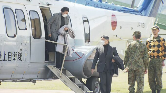 両陛下は22日午後、輪島市の能登空港からヘリコプターで航空自衛隊の輪島分屯基地へ移動し、市内の被災状況について坂口茂輪島市長から説明を受けられました。