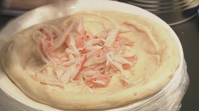 七尾駅前のパトリア内にある能登屋台村では、カニカマまつりが始まりました。常設の13店舗とスギヨがコラボし、ピザにサラダ、寿司などカニカマを使った個性的なメニューが並びました。