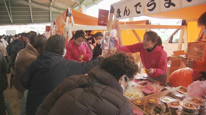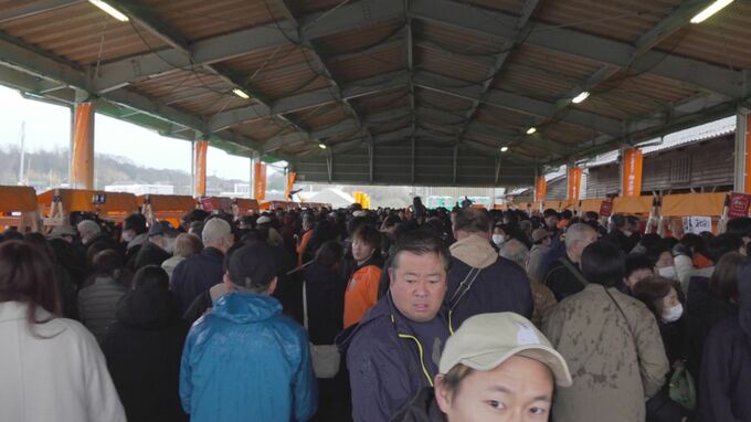 会場の外まで続く長い行列。輪島朝市は、地震による大規模な火災で再開のめどが立たないことから、90キロ余り離れた金沢市の金石港に場所を移し、「出張輪島朝市」として開催されました。