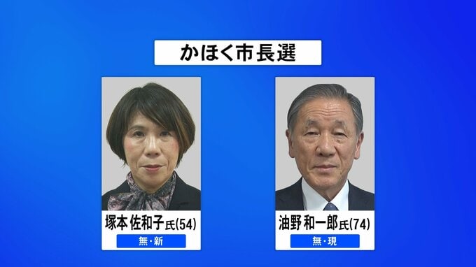 かほく市長選に立候補したのは、届け出順にいずれも無所属で、新人で前かほく市議の塚本佐和子氏(54)と、現職で6選を目指す油野和一郎氏(74)の2人です。