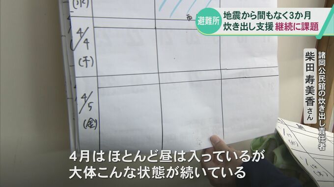 能登半島地震の発生から3か月です。100人以上が利用する輪島市内の避難所では、これまで全国から入っていた炊き出しボランティアが4月以降、減ることが見込まれていて、厳しい現実に直面しています。