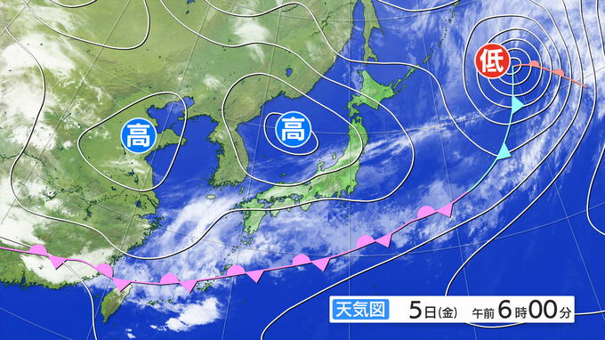 5日は、日本海を進む高気圧の影響で日本海側では晴れるところが多いでしょう。一方、太平洋側では日本の南の海上にある前線の影響で雲の広がりやすい天気になる見込みです。