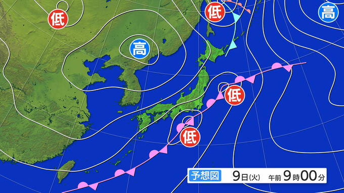 9日火曜日には、低気圧の中心は東海道沖や三陸沖に達し、九州から東北にかけて雨が降る一日になるでしょう。