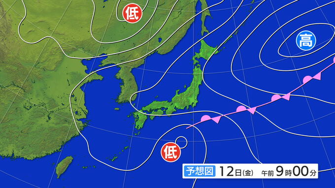 12日金曜日は、日本の南岸を通る低気圧の影響で東海から関東にかけては雲が広がりやすく、ところによっては雨が降る見込みです。