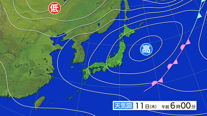 11日は高気圧の影響を受け、中国・四国より東では午前中は晴れました。ただ、午後からは雲が広がりそうです。