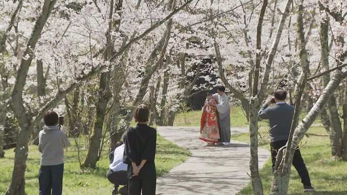 山あいに咲き誇る桜をバックに結婚式の前撮りをするカップルも。