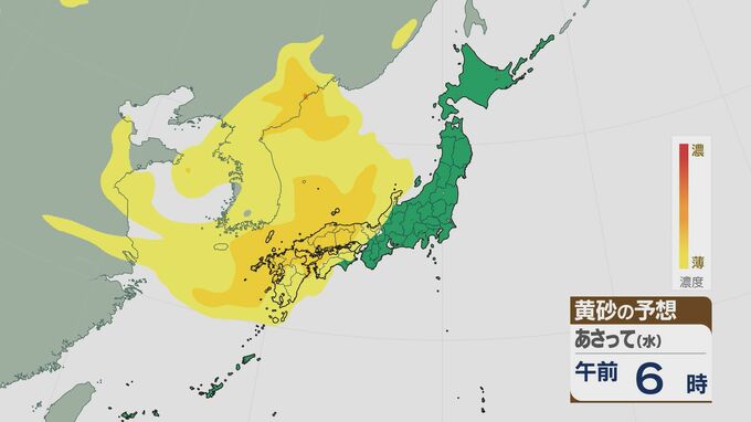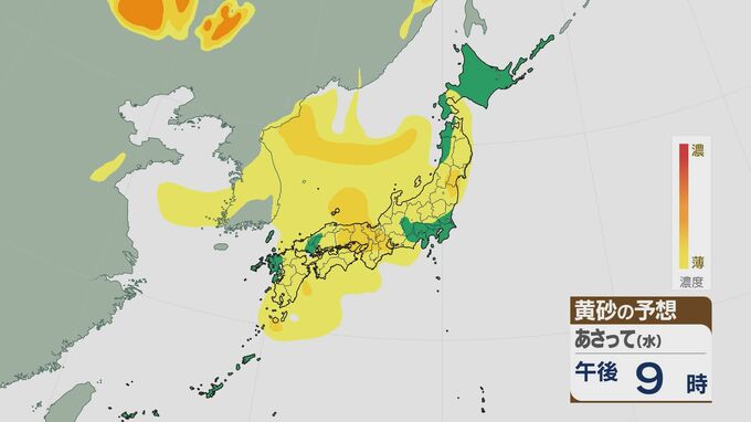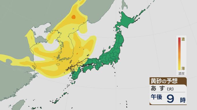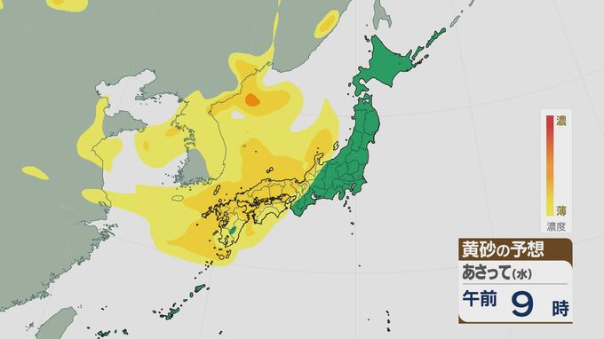 16日午後9時には九州北部や中国地方に、17日の朝は西日本の広い範囲で黄砂が飛んできそうです。