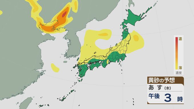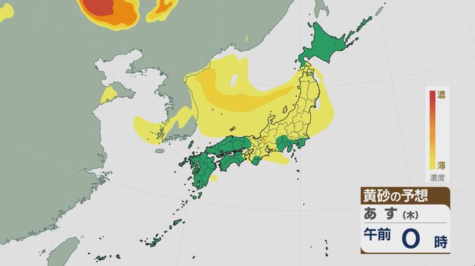 17日水曜日の夜から18日木曜日の未明にかけては、近畿や東海、関東、北陸、東北で黄砂が飛ぶ状態が続きそうです。