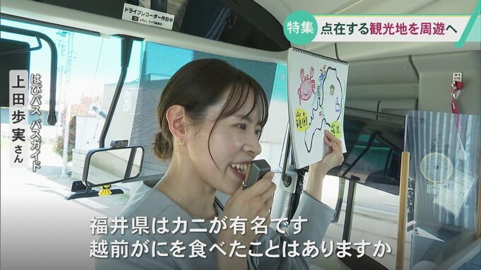 はぴバスコンソーシアム事務局・吉住愛さん「福井県には(観光地への)直行バスはあるが効率よく(観光地を)周遊するバスが今までなかったので。新幹線開業に向けて定期観光バスを企画したはぴバスには、ガイドさんがついています」