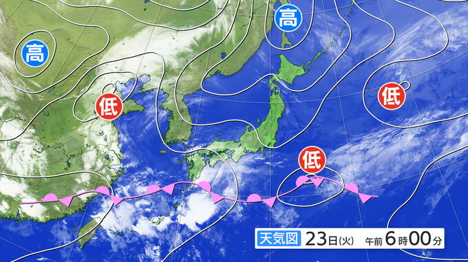 23日午前6時の天気図ですが、中国大陸から東に前線が伸び日本の南の海上にかかっています。西日本の広い範囲で雲がかかっています。
