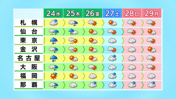 23日火曜日は西日本の太平洋側を中心に雨が降り、強まるところもある見込みです。24日水曜日には関東に雨雲がやってきそうです。