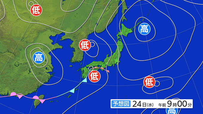 24日午前9時の予想天気図では、日本海と四国西部に2つ低気圧があり、午前中は西日本から東日本で、午後は東日本から北日本で雨が降る見込みです。