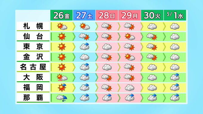 関東甲信では真夏日のところも ゴールデンウィーク初日は西日本~東日本で雨 2024年4月25日(木) 12:56 石川 26日金曜日は、前線を伴った低気圧が東へと進み西日本では日中雨が降り出すところもありそうです。 26日(金)午前9時の予想天気図 26日(金)午後3時の雨と風の予想 ゴールデンウィーク初日の27日の土曜日は、東海から関東にかけても雨が降る見込みで、低気圧の中心に近いところでは雨が強まりそうです。