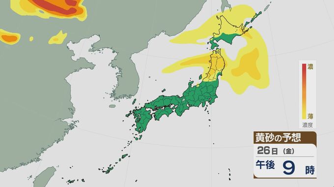 26日金曜日は東日本から北日本で黄砂がやってきそうです。昼過ぎから北陸や東北南部、北海道などで飛来が見込まれています。
